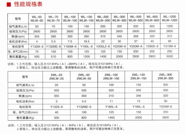 WL、WLW的抽气方式为单作用,而2WL、2WLW抽气方式为双作用,因而可获得更1匪的极限压力.